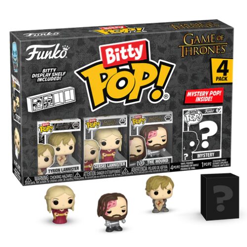 W zestawie znajdują się cztery figurki: Tyrion Lannister, Cersei Lannister, The Hound oraz jedna tajemnicza figurka Bitty Pop!. Mystery figure może być jedną z rzadkich postaci z uniwersum Game of Thrones, co sprawia, że każdy zestaw ma element niespodzianki.